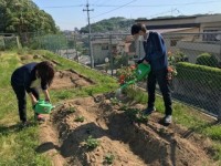 6年生の畑に畝を作って,種いもを植えて1週間。とうとう芽が出てきました!もっと大きく育つように水をあげています。大きくなあれ,大きくなあれ!大きく育ったら理科の学習で使います。